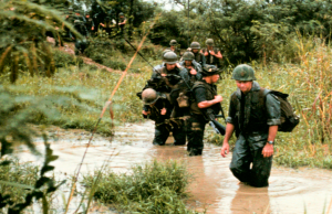 We took off our boots and dried out socks out. Our clothes dried out within the first half hour. I pulled a poncho out of my backpack and grabbed two small pieces of driftwood and made a small lean-to. The LT Col and the Sgt Major rolled over under it getting their heads and chests out of the bright sun. I was getting sunburnt, so the Sgt Major told me to move over next to him in the shade I had provided them. The Sgt Major lying next to me pulled out his transistor radio and began to listen to the American Forces Vietnam Network Station. After a song or two, they were broadcasting the Apollo 11 moon landing live. While laying there on that hot sand, we heard, “That’s one small step for a man, one giant leap for mankind.” Spoken by Neil Armstrong. It was 10:56 p.m. EDT on July 20th 1969 back in the States.