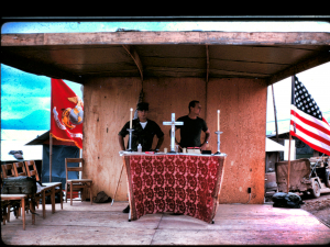 I hung around Phu Loc 6 helping sort out the mail and prepared to take the mail out to the guys in the bush. Sometimes, I went with the CO’s jeep driver and met the company commander’s guys out on Liberty Road. Other times, I was catching a helicopter ride with Lt G. E. Powell, the 2/5 Chaplain. We brought the mail and hot meals in metal canisters out to the bush. We would stay about an hour or so, feeding them hot food and cold drinks, collecting back the empty food containers, reading some scripture, said some prayers, did communion, and I took back all the new letters the guys wanted mailed back home. I enjoyed working with the Catholic Chaplain. He did the communion for the Catholics, and I helped do the communion for the protestants. This was my first involvement in becoming the Chaplain’s assistant although this was not an official position. I was still an 0311 MOS.
