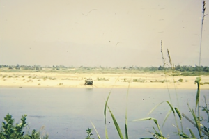 After we had wadded through the river and reached the sandy shoreline, (see the red X on the map) the unit halted, and we were pinned down on the north shore of Football Island for about two hours while Golf Company swept through the area in front of us and killed some NVA. LtCol Higgins immediately had me call up some amtracks and two tanks from behind us to provide security for us while the CO’s command post of radio operators, himself, the Sgt Major, and I laid in the sand in the hot sun.