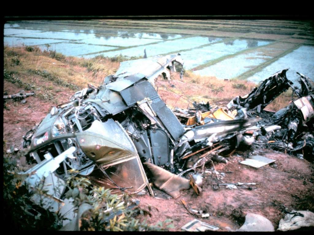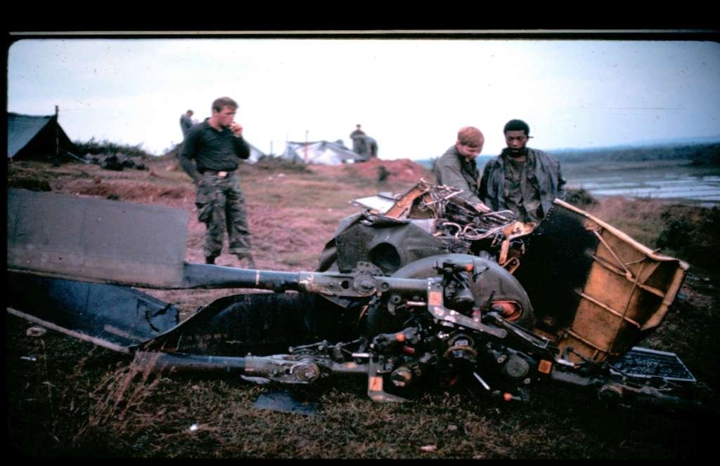 These pictures were taken by me the morning after the evening landing crash on our rice paddy Landing Zone. I believe it was a Boeing CH-46D Chinook helicopter. It crashed on Nov 7, 1969. The crashed helicopter exploded and burned throughout half of the night.