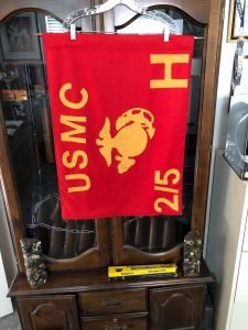 When the Hotel 2/5 reunions began in 2008, we did not yet have a USMC Guidon Flag to display and carry at our reunions. It was probably Jay Peterson’s idea to have a flag made and displayed and carried at our reunions. We have had two different guidon flags at our reunions. The first one appeared at the 2012 reunion. It was used at each reunion through the 2015 Nashville Reunion. Unfortunately, our first guidon flag was left at the hotel after the reunion that year and discarded by the hotel.