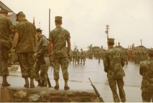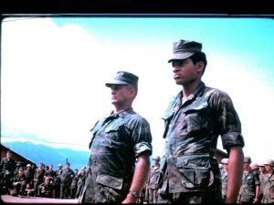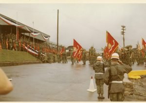Later in mid-December 1969, there was a change of command for the 1st Marine Division that my commanding officer had to attend. While I was parked in the 1st Mar Div parking lot and remaining in the jeep alone, a Colonel spotted my jeep and asked me who’s jeep this was. After I told him it belonged to Lt Col Bowen, that same Colonel standing next to me ordered me to drive up to the CP entrance. He jumped into my jeep and pointed. The only thing he told me was that I would be the third jeep in the lineup. I did as he asked and pulled out of the parking lot and into the driveway in front of the 1st Mar Div office building and pulled up behind the first two jeeps that were already parked there with the driver idling waiting for marine personnel. The Colonel jumped out of my jeep and entered the building.