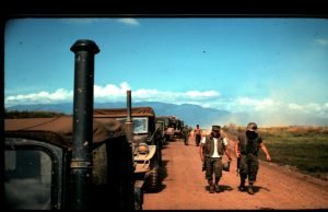 The convoys would be lined with 10 wheeler troop transport trucks, cargo trucks, armored personnel carriers, jeeps, trucks towing water, utility trailers, or armor. The road was dusty and dirty. Each of us driving or riding in a convoy ate dirt for the entire duration of the convoy. Once we were within the Da Nang safe zone, or the An Hoa compound gate, we no longer had to drive in a convoy.