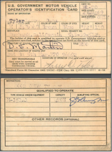 was no driver’s test. I was asked one question, “Have I ever driven a tractor?” I replied “yes”. Lt Martin handed me my ID card after I signed it and he pointed to the jeep. I jumped in it. Turned it on, gave it some gas, popped the clutch, and drove away on top of Hill 65. Wow! I had my very own brand new jeep! I drove it around the hill for about 30 minutes before I realized that it needed some fuel. I had to go back to the motor pool and fill up the tank.