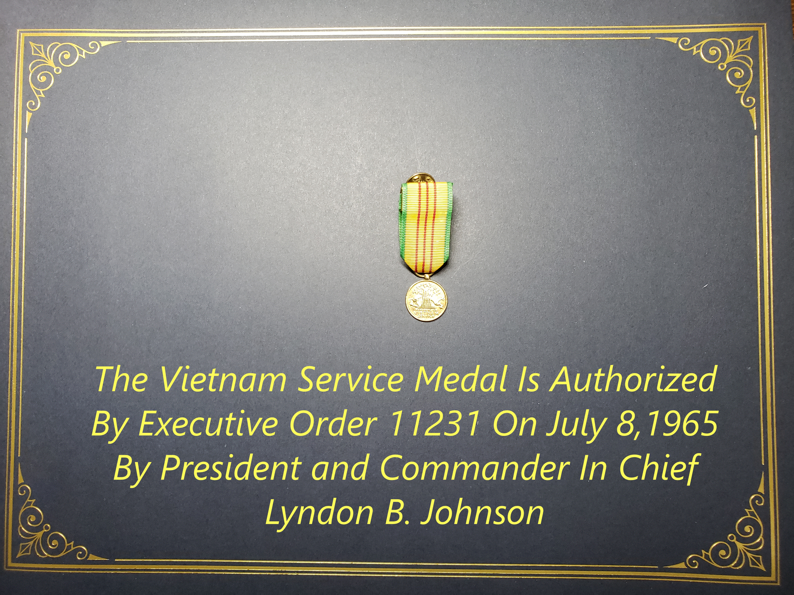 The Vietnam War Service Medal is authorized by Executive Order 11231 on July 8. 1965 by President and Commander in Chief, Lyndon Baines Johnson.
