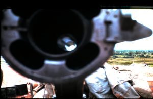 Larry looking down the barrel of an M40 106mm Recoilless Rife overlooking the Arizona Territory on Hill 65.